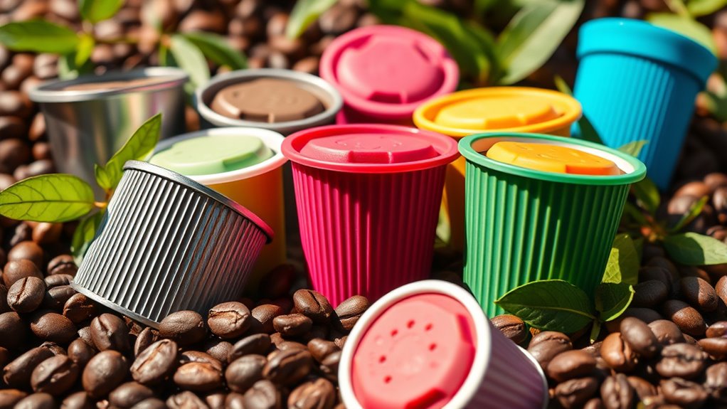 Choosing reusable K-Cup pods offers a meaningful way to reduce environmental impact, especially since single-use capsules generate over 10 billion units of waste annually. By opting for eco-friendly materials like stainless steel or BPA-free plastics, I can minimize harm to the environment and prevent chemicals from leaching into my coffee. Reusable pods cut down on reliance on disposable ones, which often contain non-recyclable parts and contribute to ocean pollution. Their extended lifespan—up to 10 years or more—further reduces waste, supporting long-term sustainability. Proper disposal or recycling of stainless steel or BPA-free pods at the end of their life guarantees responsible waste management. Overall, choosing reusable options helps me lessen my carbon footprint and promotes a healthier planet.