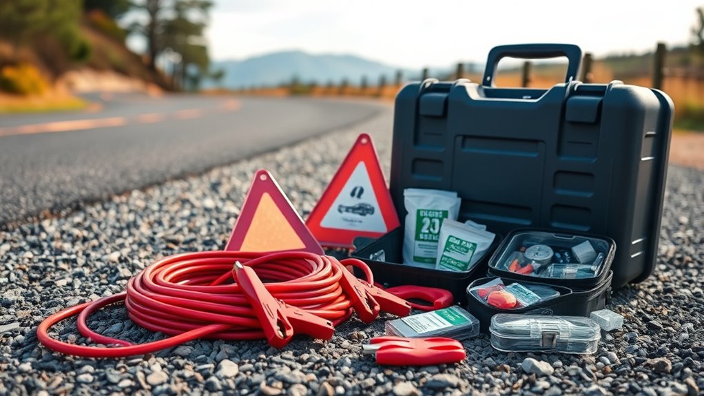 When selecting a roadside emergency kit with jumper cables, prioritizing tool quality and durability is essential for reliable performance in emergencies. High-quality jumper cables should have UL certification, insulated rubber sleeves, and thicker gauges like 6 or 8 for safer, more efficient power transfer. Durable tools are made from corrosion-resistant materials such as high-carbon steel, stainless steel, or reinforced plastics, ensuring they withstand frequent use and tough conditions. Safety accessories like reflective triangles and vests should utilize weather-resistant fabrics to maintain visibility and integrity over time. Heavy-duty gloves with reinforced fingertips and non-slip surfaces protect your hands and last through repeated use. Sturdy storage cases made from impact-resistant plastics or reinforced nylon further enhance overall durability, safeguarding your tools when you need them most.