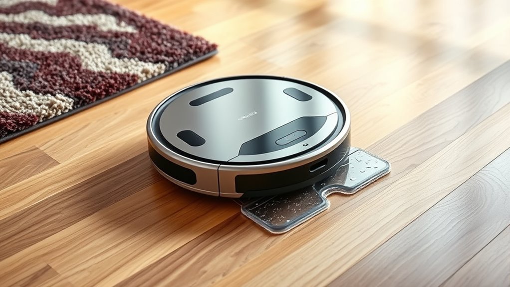 To effectively clean both hard floors and carpets, you need a robot vacuum with strong suction power and versatile mopping features. A suction force of 5000Pa or higher guarantees it can pull out embedded dirt, pet hair, and debris from various surfaces. Many models also include adjustable water flow settings, so you can customize the mopping intensity based on the floor type. Combining powerful suction with effective mopping requires a balanced design to prevent water damage or streaks, especially on delicate surfaces. Some robots automatically boost suction when detecting carpets, improving deep cleaning. Additionally, features like auto-lift mops and precise water control help guarantee thorough cleaning without leaving excess moisture. This combination makes for a more efficient, versatile cleaning experience.