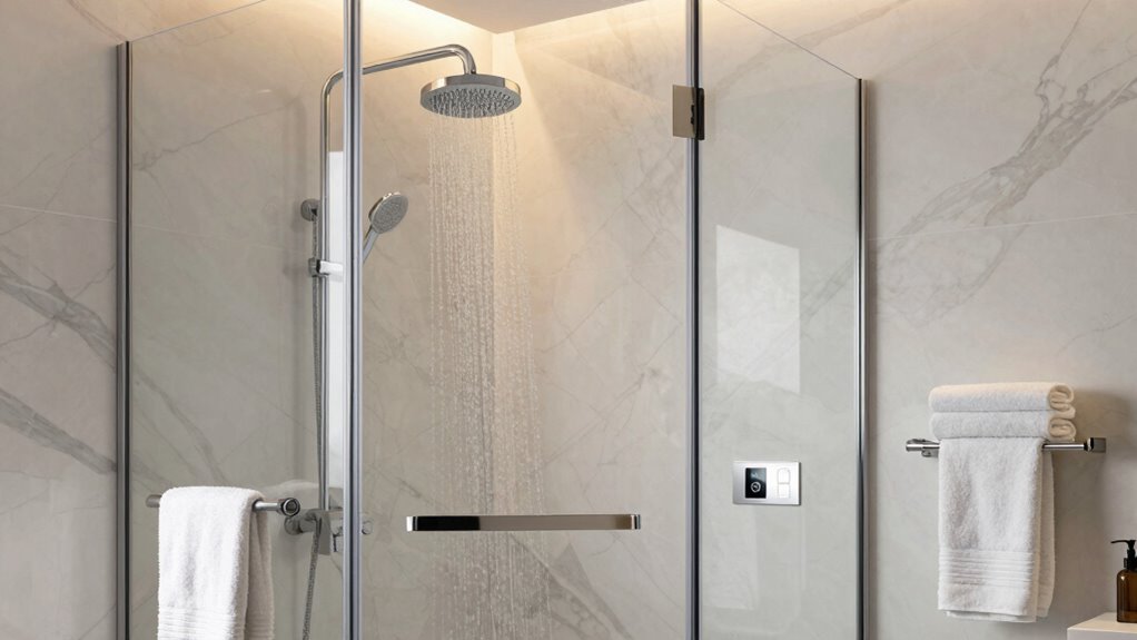 To keep your shower system functioning properly, I recommend regular cleaning of the nozzles, controls, and filters to prevent buildup. Check for leaks or drips and tighten fittings as needed. It’s also good to inspect the water pressure and replace any worn-out parts promptly. Regular maintenance like descaling if you have hard water guarantees your shower continues to perform well and lasts longer.