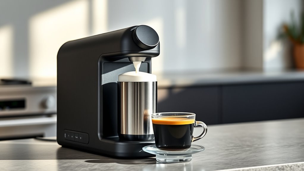 When choosing a single-serve coffee maker with a built-in frother, it’s vital to take into account both price and warranty to get the most value for your investment. Consider the warranty length and coverage to guarantee you’re protected against defects and malfunctions, which adds long-term value. Compare the initial price with potential costs for replacement parts or extended warranties to understand the total investment. Look for models that feature auto-cleaning and descaling, as these reduce maintenance costs and extend the device’s lifespan. Some machines include free accessories like reusable filters or milk frothers, boosting value without extra expense. Finally, read customer reviews and check brand reputation to confirm the price reflects reliable quality and responsive warranty support.
