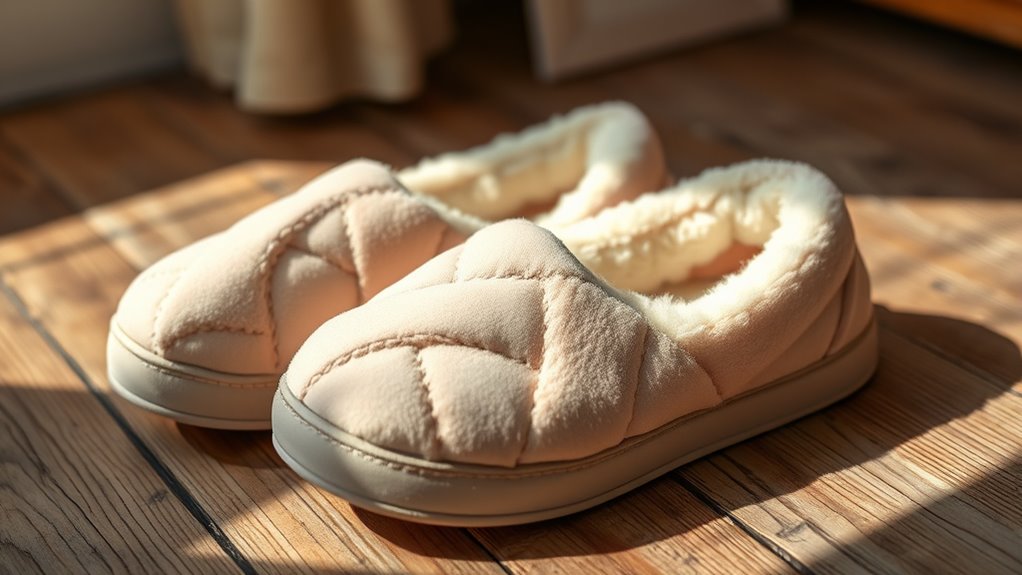 Choosing slippers with memory foam that keep your feet warm requires attention to insulation features. Look for slippers lined with plush materials like faux fur or fleece, which help trap heat and boost thermal retention. Thicker memory foam insoles are also beneficial, as they prevent heat from escaping and keep your feet cozy longer. Slippers with closed-back or high-top designs offer more coverage, providing extra warmth compared to open-toe styles. Additionally, the outer material plays an essential role; wool or synthetic fibers can markedly improve insulation, shielding your feet from cold air. When selecting slippers, prioritize these features to guarantee your feet stay warm and comfortable, even during the coldest months. Proper insulation makes all the difference in maintaining warmth throughout the day.