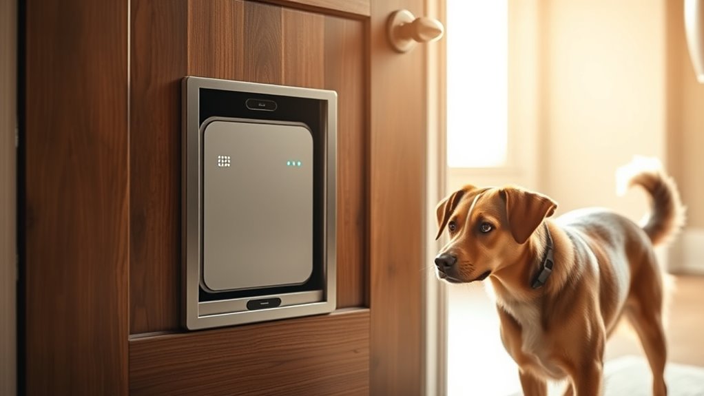 Choosing a smart dog door with microchip access requires verifying that the device supports the same microchip technology your pet has implanted, such as FDXB, AVID, or ISO standards. It’s crucial to confirm that the door can recognize the specific digit length of your pet’s microchip number, whether it’s 9, 10, or 15 digits, to guarantee proper access. Additionally, check if the system allows programming collar tags as an alternative entry method for pets without microchips. For households with multiple pets, confirm that the door can store several microchip identities—typically up to 32—to accommodate everyone. Finally, make sure the microchip scanning system is compatible with the microchips used in your region and by your microchip provider, avoiding access issues down the line.