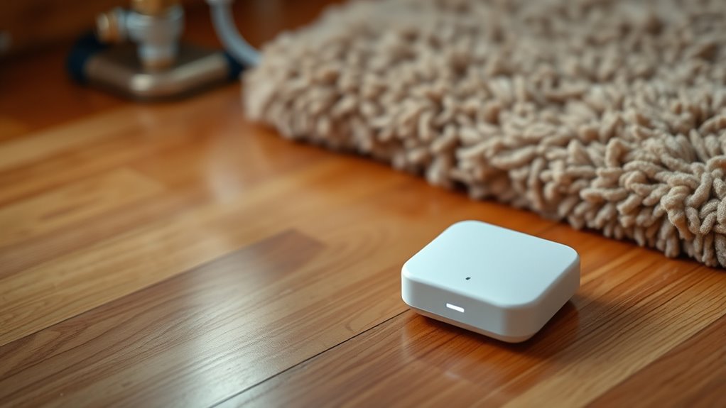 Selecting a leak sensor that’s easy to place isn’t just about size—it’s about design and versatility. I look for models that are compact and lightweight, making it simple to fit into tight or hard-to-reach spots. Sensors with minimal installation tools—like adhesive backing or just placing them on flat surfaces—save time and effort. Flexible options, such as surface mounting or free-standing setups, give me more placement choices depending on the area. Clearly labeled sensors help me quickly identify and relocate them if needed. I also prefer devices with straightforward setup procedures, like plug-and-play or app-guided installation, so I can get them working fast without hassle. Ease of placement ensures I can protect every critical spot efficiently.