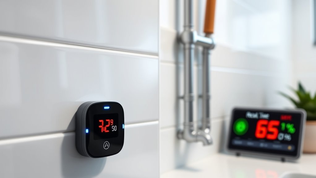 When choosing a smart leak detector with temperature alerts, considering its environmental durability and placement options is essential for reliable operation. Look for devices with an IP67 waterproof rating to withstand humidity, splashes, and even accidental submersion. If you plan to install the detector outdoors or in sun-exposed areas, select one with a UV-resistant shell to prevent damage from sunlight. In dusty or dirty environments, opt for sealed designs that keep debris out and ensure consistent performance. Additionally, consider the mounting options—wall, magnetic, or tabletop—to secure the detector effectively in its environment. Finally, verify that the operating temperature range aligns with your space’s conditions to avoid false alarms or sensor damage in extreme cold or heat. Proper environmental considerations ensure longevity and dependable alerts.