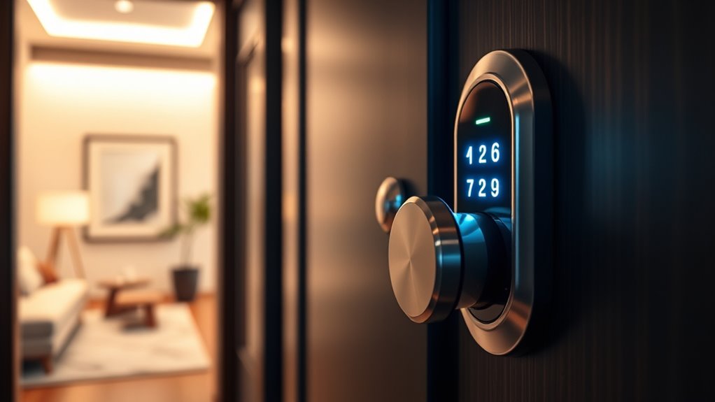 As you explore smart locks for your apartment, remote access capabilities are essential for convenience and security. Look for locks that allow you to secure and open your door from anywhere using a dedicated app. It’s vital to guarantee the lock uses secure encryption protocols, like bank-grade encryption, to keep your remote communications safe. Real-time activity logs and notifications are also valuable, as they let you monitor access attempts and unauthorized entries remotely. Make sure the lock is compatible with your existing smart home ecosystem, such as Wi-Fi, Z-Wave, or Zigbee, for seamless control. Lastly, consider whether it allows temporary or scheduled access sharing, so you can manage who enters your home and when.