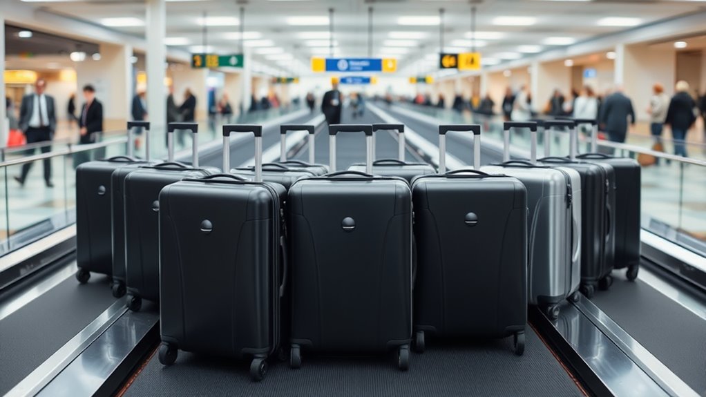 When selecting smart luggage with GPS tracking, waterproofing and durability are crucial factors to guarantee your bag withstands the rigors of travel. A high waterproof rating, like IP67 or IP68, ensures your luggage can handle rain, splashes, and brief submersion, protecting the electronics inside. Durable features such as impact-resistant shells and reinforced corners help prevent damage from rough handling. Rugged materials like polycarbonate or reinforced alloy steel extend the lifespan of both the luggage and its GPS components. Sealing gaskets and weather-resistant covers further shield electronic parts from dust, dirt, and moisture. Prioritizing these features means less worry about damage or repairs, especially if you travel often or venture into outdoor environments. Ultimately, waterproof and durable luggage keeps your belongings safe and functional throughout your journeys.
