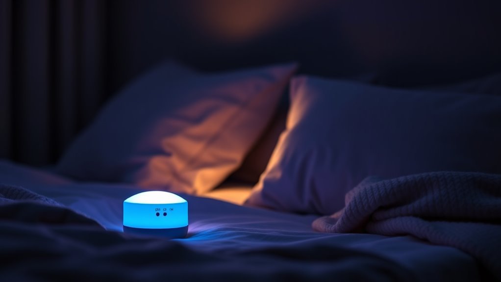 Imagine having a secret weapon for perfect sleep—these smart night lights do include customizable sound options. I’ve set mine to gentle rain and soft lullabies, creating my ideal sleep sanctuary. You can personalize sounds to match your mood or bedtime routine, making falling asleep easier. It’s like having a modern fairy tale, where technology helps you rest better. Trust me, these features truly enhance your sleep experience.