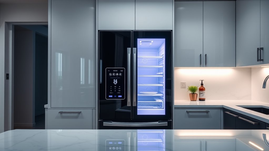 If you’re upgrading to a futuristic kitchen, I recommend exploring the top smart refrigerators with touch screens. Options like the Samsung RF29DB9900QD, LG InstaView, and Cafe models offer sleek designs, large displays, and smart features like Wi-Fi connectivity, voice control, and customizable panels. These fridges combine style with functionality, making food management effortless. Keep in mind capacity and integration options—if you continue, you’ll discover the best features to fit your needs.