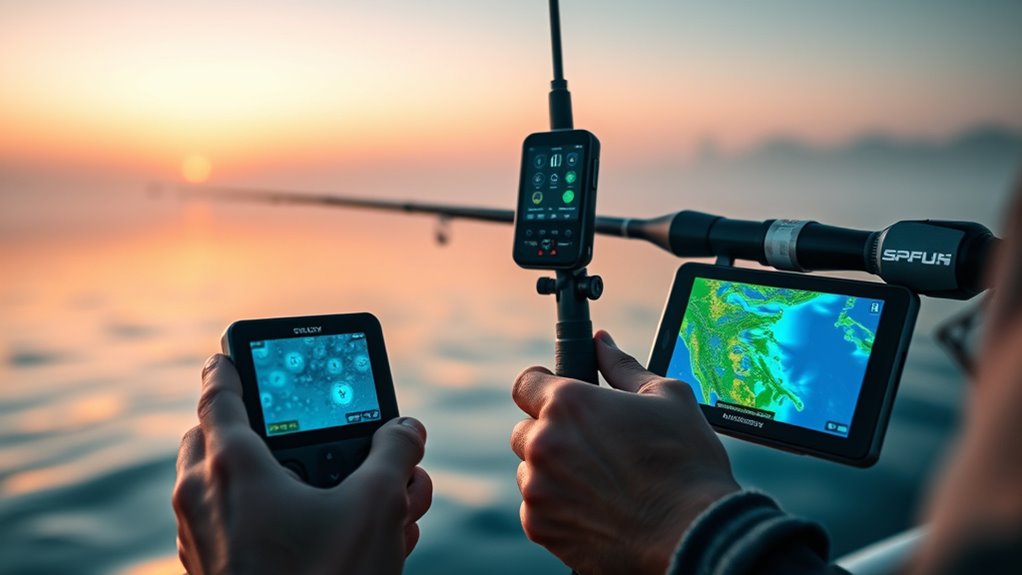 Think of these gadgets as versatile explorers, ready to navigate both freshwater lakes and salty seas. I’ve found most smart fishing devices are designed for dual environments, with corrosion-resistant materials and adaptable features. They work seamlessly in rivers, ponds, or oceans. Just make sure to check the specifications, as some models excel in one setting but can handle both. This way, your catch game stays strong wherever you fish.