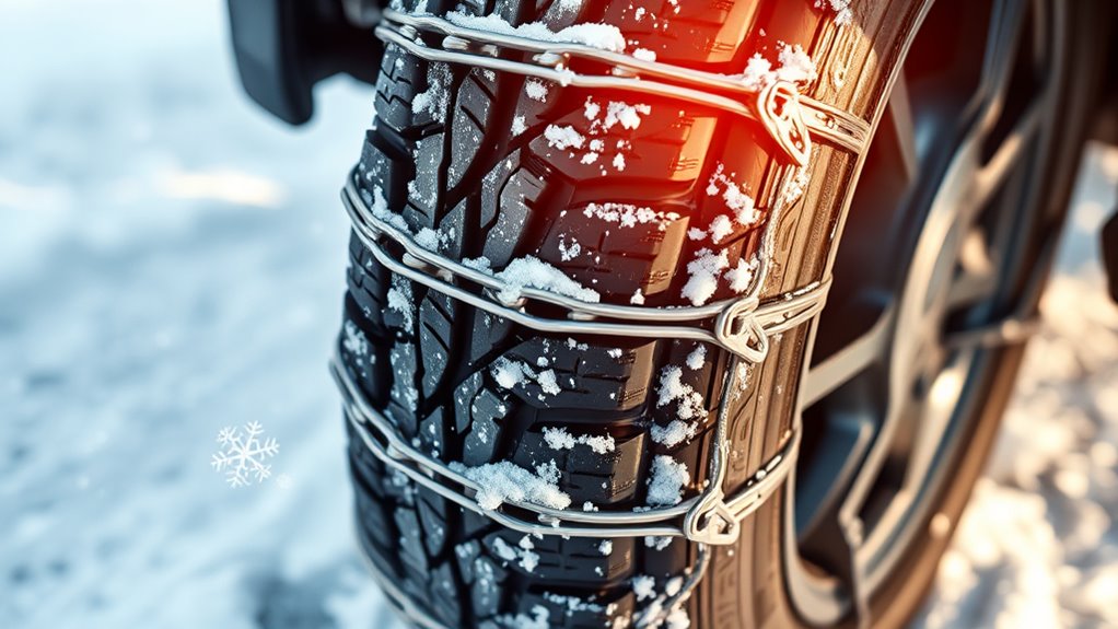 Having navigated icy roads myself, I know snow chains are like trusty snowshoes—without them, you’re just slipping and sliding. After all, studies show that proper chains can improve traction by up to 50%. Think of them as your vehicle’s winter armor, giving you the confidence to conquer snow-covered paths. So, gear up wisely; with the right chains, you’ll glide through winter’s toughest days just like I did—safely and smoothly.