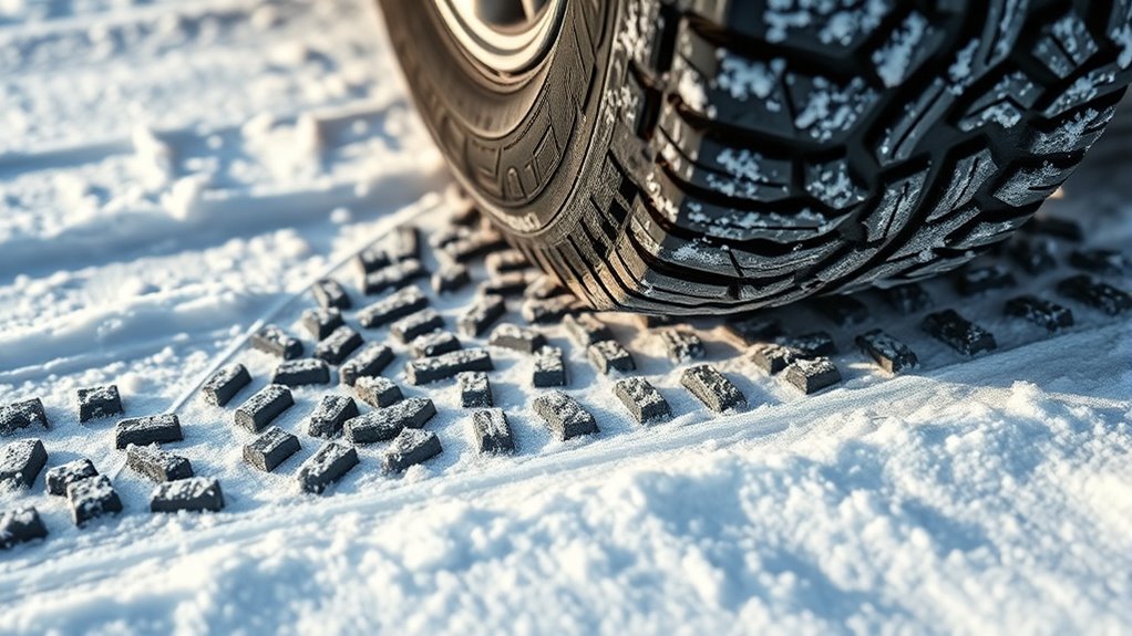 Selecting the right snow traction mats requires considering the terrain you’ll encounter, as different surfaces demand different features for ideal performance. For snow and sand, mats with textured patterns, honeycomb designs, or alloy studs excel at providing grip on soft, loose surfaces. Conversely, icy or frozen ground needs mats with aggressive studs or cleats that bite into the ice for stability. The material also matters; high-strength rubber or impact-resistant plastics guarantee durability across various terrains. Additionally, look for mats that can be adjusted or shaped to fit uneven ground contours, enhancing contact and grip. By matching your mats to the terrain, you’ll make certain better traction, safer driving, and fewer stuck moments in winter conditions.