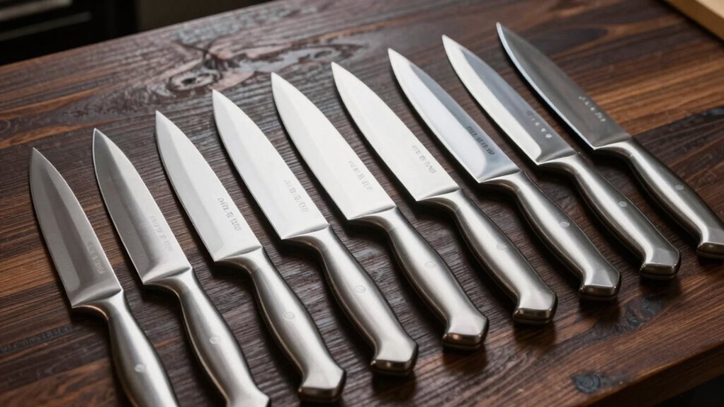 Choosing the right stainless steel for your chef knife involves understanding its composition, as it directly affects performance and durability. High-quality steels typically contain 13% to 17% chromium, boosting corrosion resistance and longevity. The carbon content, usually between 0.3% and 0.75%, determines hardness and edge retention; higher carbon levels create sharper, longer-lasting edges. Different steel grades like 5Cr15Mov or German 1.4116 balance toughness, resistance, and ease of sharpening, influencing overall performance. Alloy elements such as molybdenum and vanadium further enhance corrosion resistance and hardness, making blades more resilient. Higher HRC ratings, between 56 and 60, indicate harder blades that maintain sharpness longer but may be more brittle. Understanding these factors helps you choose a steel that matches your cutting needs and maintenance preferences.