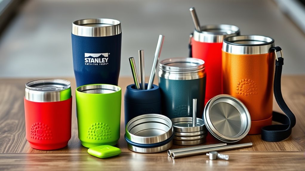 I’ve found the 15 best Stanley tumbler accessories that truly upgrade your hydration game. From protective silicone sleeves, stylish charms, and glitter boots to reusable straws, strap carriers, and leak-proof caps, these add both style and functionality. Whether you want to personalize your tumbler or keep drinks hot or cold longer, there’s something for everyone. Stick around to discover how these accessories can transform your everyday hydration experience and reflect your personal style.