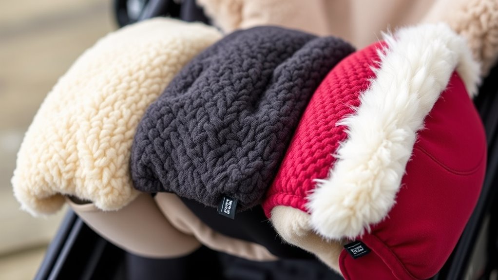 Choosing stroller hand muffs that are built with durable, water-resistant fabrics like nylon or Oxford guarantees they can withstand harsh winter conditions. These materials are vital for protecting your hands from snow, rain, and wind during outdoor walks. The lining, preferably fleece, wool, or plush, should be soft and insulating to keep your hands warm in freezing temperatures. Sealed seams and reinforced stitching are essential features that improve durability, preventing tears and wear over time. Additionally, selecting muffs made from machine-washable or easy-to-clean materials ensures they stay hygienic and in good condition after repeated use. An outer shell resistant to wind, snow, and rain is key to maintaining dryness and comfort, making these muffs reliable companions through cold, wet winters.