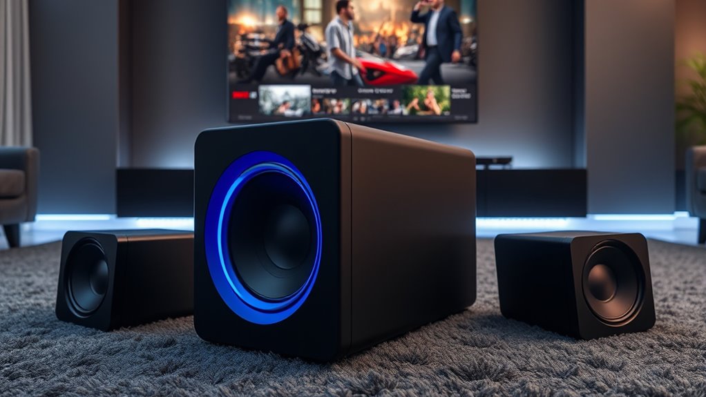 Choosing the right subwoofer for your home theater depends heavily on your room size. Larger rooms need subwoofers with bigger drivers, like 12 inches or more, and higher wattage to fill the space without distortion. Smaller to medium rooms can get by with compact subwoofers featuring 6.5 to 10-inch drivers, which still deliver solid bass. Placement also plays a vital role; positioning the subwoofer correctly within your room can greatly improve bass response and overall sound quality. Additionally, consider the subwoofer’s frequency response range to guarantee it matches your room’s acoustics, providing balanced and immersive sound. Matching your subwoofer’s power and size to your room’s dimensions helps achieve deep, clear bass without overwhelming the space or sacrificing sound clarity.