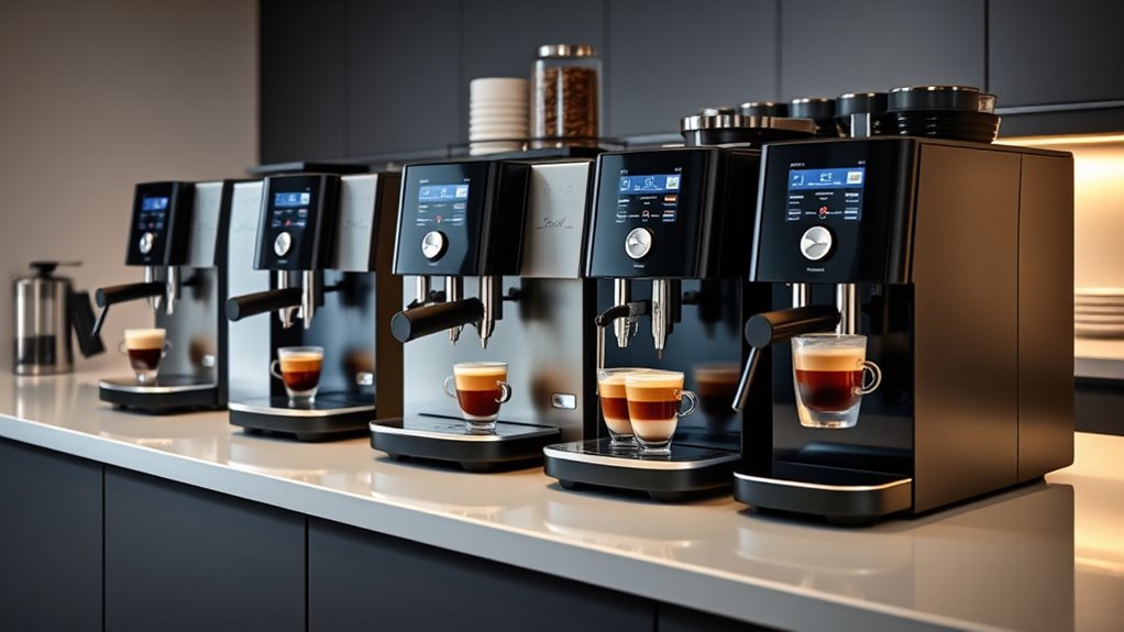 Choosing a super automatic espresso machine that offers extensive brewing customization can make a significant difference in achieving your perfect cup. Look for models with multiple preset drinks, but also allow you to tweak strength, volume, and temperature to match your preferences. Customizable milk frothing options, like automatic or manual steam wands, give you control over foam texture and milk-based drinks. The ability to save personalized recipes or user profiles guarantees quick access to your favorite settings for consistent results. Additionally, adjustable grind settings and brew parameters help optimize flavor extraction for different beans and roast levels. Finally, intuitive controls or digital interfaces make customizing your brew simple and efficient, ensuring you can craft coffee exactly the way you like it, every time.