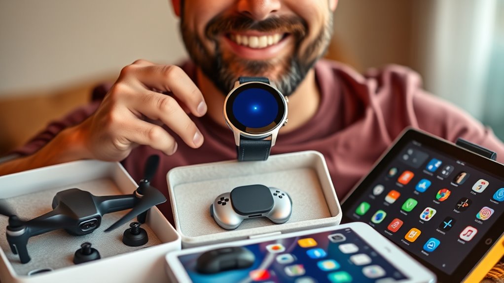 Choosing a tech gift for dad in 2025 becomes much easier when you prioritize ease of use, as devices with intuitive controls and simple setup processes make a big difference. Look for products that offer straightforward installation, like automatic pairing or one-touch operation, so dad can start using them right away without frustration. Compatibility with common devices and operating systems also simplifies integration, reducing the learning curve. Clear instructions and minimal configuration requirements help him enjoy the gift quickly. Ergonomic designs and user-friendly interfaces enhance comfort and ease of navigation, especially for those less familiar with technology. Features that promote effortless operation, like simple charging methods, encourage regular use and make the gift truly valuable and accessible.