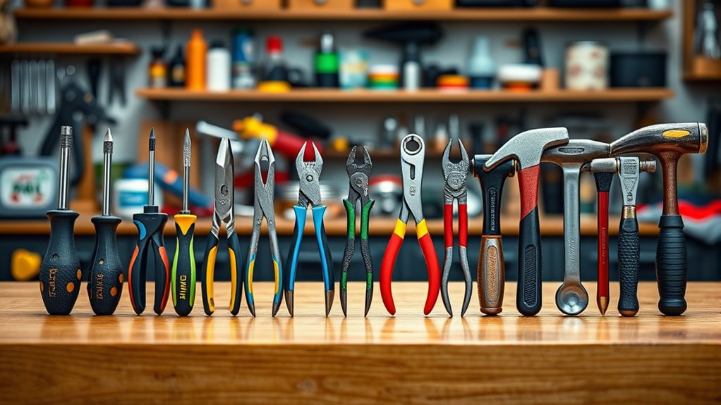 Choosing the right tools isn’t just about versatility; quality and durability play a *vital* role in ensuring those tools stand up to regular use. High-quality materials like heat-treated chrome vanadium steel make tools stronger and more resistant to wear and corrosion, so they last longer. Durable construction, including reinforced handles with TPR or ergonomic grips, offers comfort and reduces fatigue during extended projects. Tools that meet industry safety standards, such as ANSI or ISO, provide added reliability and lower the risk of failure. Investing in rust-resistant finishes helps maintain their appearance and prolongs lifespan, even in moist environments. Additionally, well-made storage cases protect tools from damage and keep them organized, ensuring your set remains in top condition for years to come.
