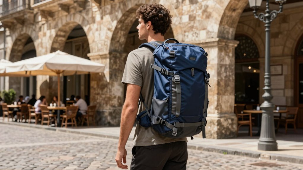 Ergonomic support features are essential for tall travelers aiming to stay comfortable during long journeys through Europe. Padded shoulder straps and breathable back panels help distribute weight evenly, easing pressure on shoulders and the spine. Adjustable straps and lumbar support cushions let me customize the fit, ensuring proper posture even during extended wear. Contoured back designs that follow my natural spine curve boost comfort and help prevent back pain. Weight distribution systems, like multiple load-bearing points, reduce pressure points and make carrying easier. Stabilizing features such as sternum straps and hip belts keep the backpack steady, preventing unnecessary movement and reducing fatigue. These ergonomic elements work together to enhance comfort, allowing me to explore Europe without discomfort or strain.