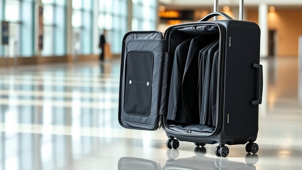 Security is a critical factor when selecting a travel garment bag with wheels, as it helps safeguard your belongings from theft or tampering during transit. Look for bags with lockable zippers or integrated locking mechanisms to keep your clothes and valuables protected. TSA-approved locks are especially convenient, allowing security checks without compromising your belongings. Make sure the locking features are durable and resistant to tampering or forced entry to prevent unauthorized access. It’s also wise to verify that the locks comply with airline and security regulations, avoiding issues during screening. For added security, choose bags with multiple lock points, which help safeguard different compartments and valuables. Prioritizing these features ensures your belongings stay safe and intact throughout your journey.