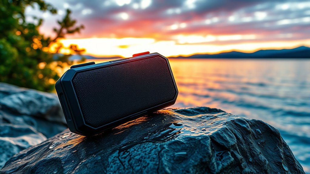 Choosing a waterproof Bluetooth speaker means considering how well it can withstand outdoor elements and rough handling. I look for models with an IPX5 rating or higher, ensuring resistance against water, dust, and impacts. Durable materials like reinforced plastics, rubberized exteriors, and silicone coatings are essential for protecting internal components from water damage and shocks. Tight sealing with waterproof gaskets or rubber seals around ports and buttons prevents water ingress, boosting longevity. I also prioritize shock-resistant designs made from impact-absorbing materials, which help the speaker endure drops and rough use. Additionally, high-quality, corrosion-resistant metals and plastics ensure the speaker withstands exposure to salt, moisture, and environmental stressors over time. These durability factors give me confidence in my speaker’s ability to perform outdoors and in active environments.