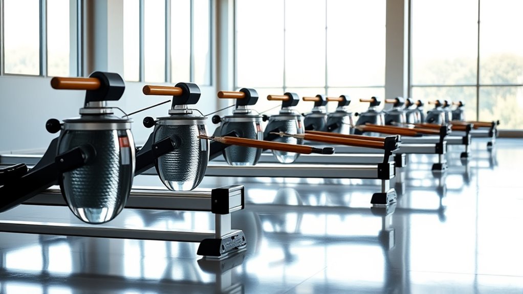 Water-resistance rowing machines are known for producing soothing water sounds that can enhance your workout ambiance. These sounds range from gentle splashes to louder waves, depending on water level and your rowing speed. Generally, water rowers are quieter than air-resistance models but louder than magnetic ones, making them suitable for most home environments. The noise level can increase with higher water volumes and faster strokes, so adjusting water levels can help manage sound intensity. Proper maintenance, like keeping the water clean and the tank free of debris, also minimizes splashing noises and air bubbles. Overall, water rowers offer a natural, calming soundscape that enhances your workout without being disruptive. Their noise profile strikes a good balance between immersion and quietness.