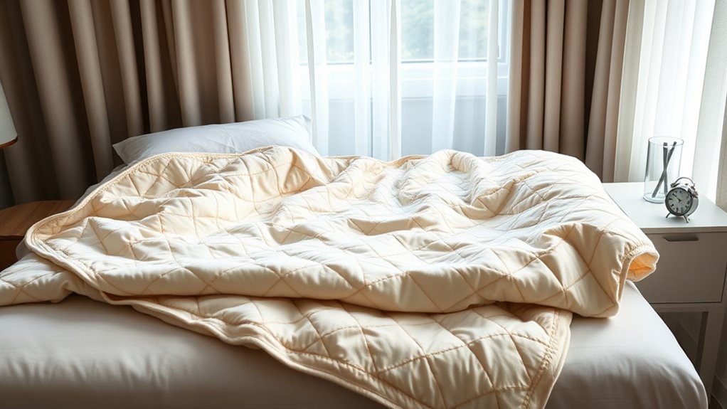 Choosing the right weight for a weighted blanket is essential for comfort and effectiveness. Generally, the ideal weight is 7-12% of your body weight, ensuring even pressure distribution that promotes relaxation and better sleep. If the blanket is too heavy, it can cause discomfort or restrict movement, while a lighter one might not provide enough calming pressure. For beginners, starting with a lighter option within the recommended range helps your body adjust comfortably. For children or sensitive individuals, a lighter weight—closer to 5-7%—is preferable for safety and comfort. Proper weight selection guarantees the blanket applies gentle, consistent pressure without overwhelming you, making it a vital step toward maximizing the calming benefits and improving sleep quality.