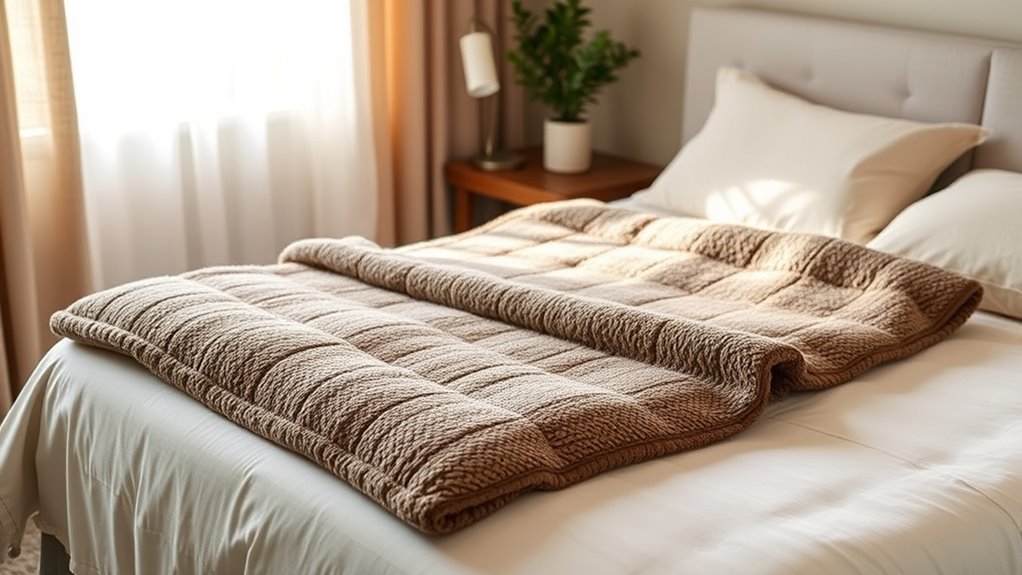 Ensuring your weighted blanket fits properly is essential for both comfort and effectiveness. It should cover your body without hanging over the edges, providing a snug fit that feels secure but not restrictive. I recommend choosing a blanket that aligns with your body measurements and provides about 8-12% of your body weight. This weight range helps distribute pressure evenly, promoting relaxation without feeling heavy or uncomfortable. Make sure the dimensions suit your height and allow for movement, especially if you tend to shift during sleep. A well-fitting blanket stays in place and offers consistent pressure, which is key to easing anxiety and improving sleep quality. Always verify the size and weight recommendations to match your personal comfort preferences.