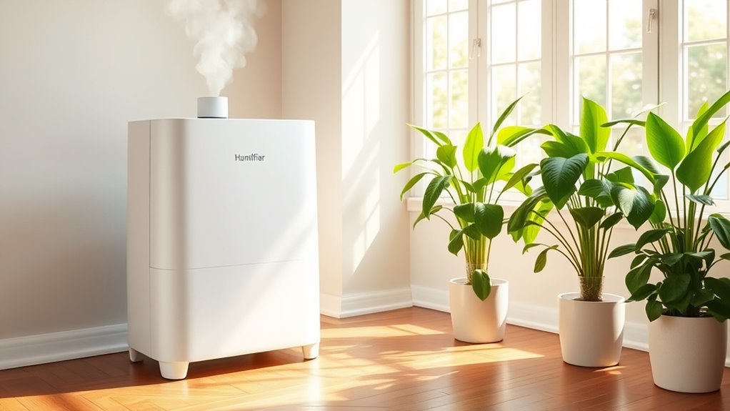 These whole house humidifiers are quite energy-efficient, especially models with automatic controls and adjustable settings. I’ve found they use minimal power while effectively maintaining ideal humidity levels. By operating only when needed, they help save energy and reduce costs. Plus, modern units are designed with energy-saving features that make them an eco-friendly choice, ensuring comfort without a big impact on your energy bill.