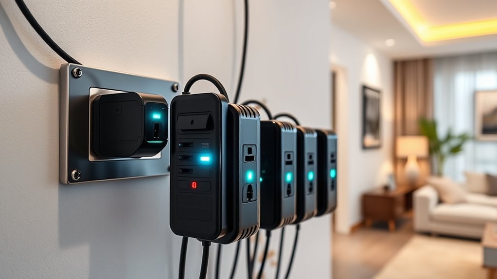 When evaluating whole-house surge protectors, it’s important to regard the indicators and alerts they provide, as these features help you monitor protection status easily. LED status indicators are common and show whether the device is actively protecting your home or needs replacement. Visual signals like red flags or flashing LEDs alert you when internal components, such as MOVs, require maintenance or have failed. Some units include audible alarms that notify you of surge events or if protection has been compromised, providing real-time awareness. Additionally, certain surge protectors offer remote notifications via WiFi or app alerts, so you can stay informed about surge activity and device status even when you’re away. These alerts are essential for ensuring your home’s ongoing safety and protection.