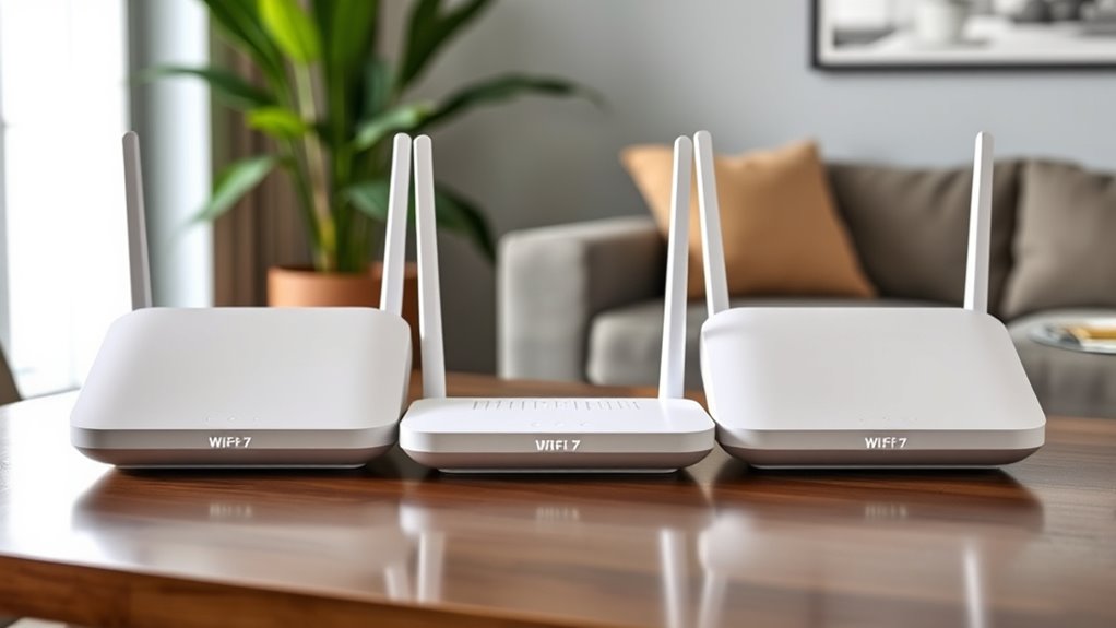 As you explore your options for a Wi-Fi 7 mesh system, it’s crucial to take into account device compatibility to guarantee a smooth connection throughout your home. First, ensure the system supports all Wi-Fi generations—4, 5, 6, and 7—so you don’t run into issues with older devices. It’s also important to verify that the mesh system is backward compatible, preventing connectivity hiccups. Look for features like Multi-Link Operation (MLO) and 4K-QAM for enhanced performance. Don’t forget to confirm compatibility with your internet service provider’s modem and plan to avoid setup conflicts or speed limitations. Finally, consider systems that seamlessly integrate with smart home devices and voice assistants for a broader device ecosystem.