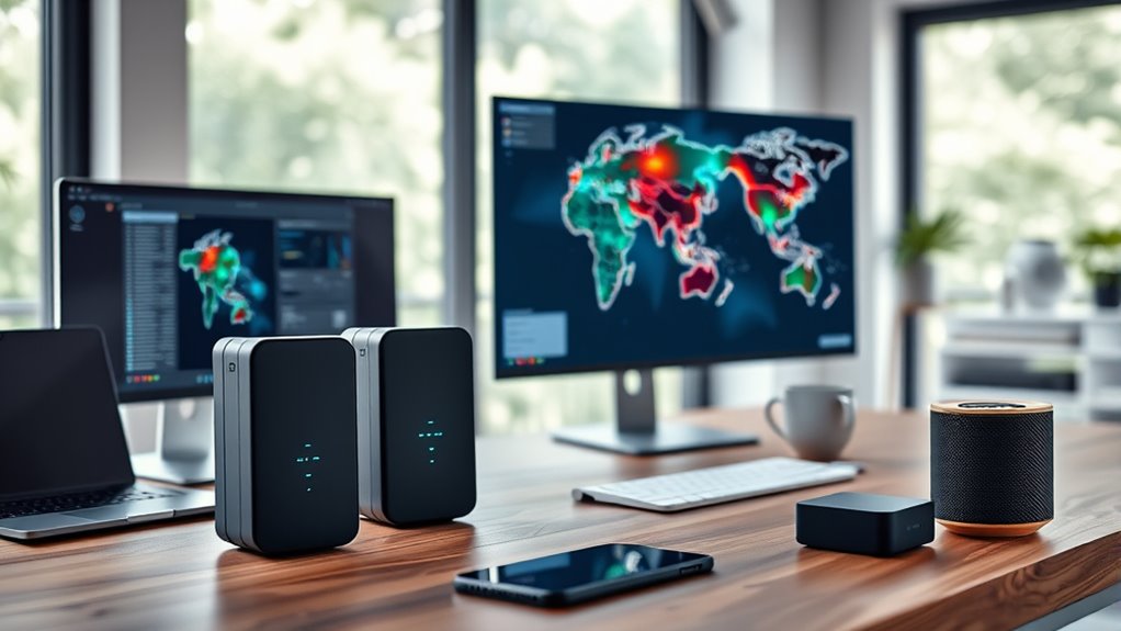 When selecting a Wi-Fi mesh system for your home or office, ensuring it supports smart home integration is essential for a seamless experience. Look for systems that work effortlessly with popular voice assistants like Amazon Alexa and Google Assistant, allowing voice control of your devices. Compatibility with various smart home gadgets—IoT sensors, security cameras, and smart speakers—is pivotal for creating a unified ecosystem. Confirm the system offers features like dedicated guest networks and device prioritization to manage traffic efficiently. Security is also critical; choose systems supporting WPA3 encryption and security services like TP-Link HomeShield or NETGEAR Armor to protect your smart devices. Finally, opt for systems with user-friendly apps that enable remote control, device grouping, and automation, making your smart home truly integrated and manageable.