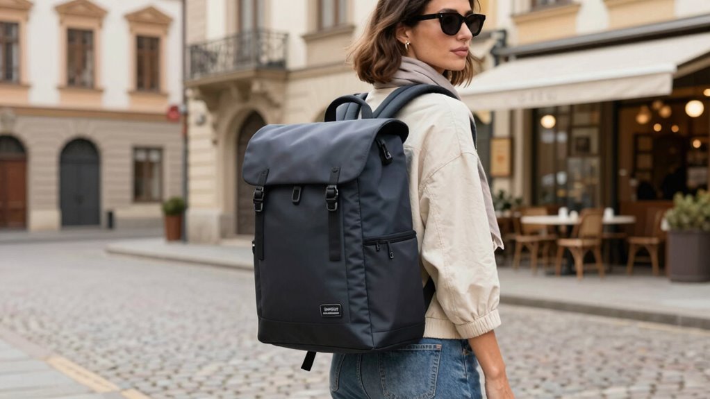 Travel compatibility is key to ensuring your backpack fits seamlessly into your European adventures. First, I check that it meets airline carry-on size restrictions, usually around 18 x 14 x 8 inches, to avoid checked baggage fees. A TSA-friendly laptop compartment that opens fully is a lifesaver during security checks, making the process quick and hassle-free. I also look for a backpack with a luggage strap or sleeve so I can slide it onto my rolling suitcase, easing mobility through busy airports. Weight matters too—I prefer a lightweight bag that stays within airline weight limits and doesn’t strain my shoulders during long days of sightseeing. In conclusion, multiple compartments and quick-access pockets help me stay organized, enabling smooth transitions through security and customs without fumbling.
